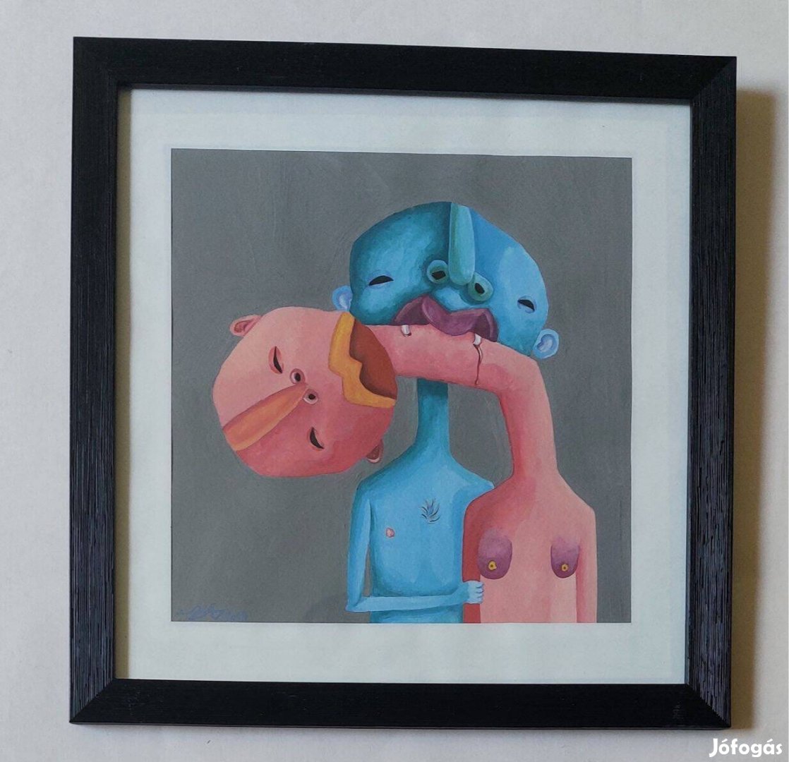 Egyedi gouache festmény keretben. Fa keret üveggel. Keret mérete: 31x30,5 cm, kép mérete: 22x21cm.