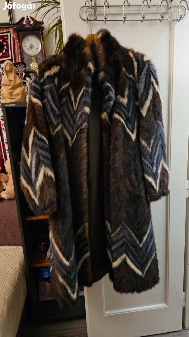 Egyedi tervezésű, vintage valódi prémes kabát, mely ritka, zigzag mintázattal rendelkezik: sötétbarna-fekete alapon feltűnő fehér-kék csíkok futnak végig elöl és hátul. A prémes anyag puha és sűrű szőrzetű, alig használt, kiváló állapotban van, belső bélése hibátlan, gombos záródással.