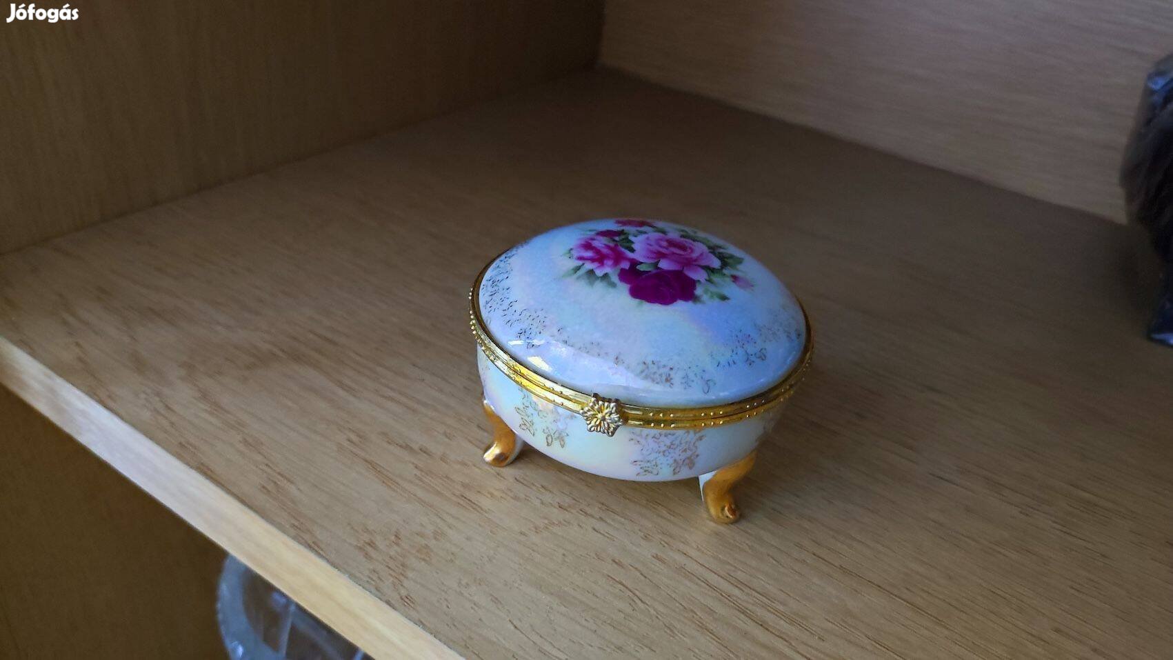 Ez egy virágmintás, lábakkal és aranyozott fém szegéllyel díszített porcelán ékszertartó doboz.