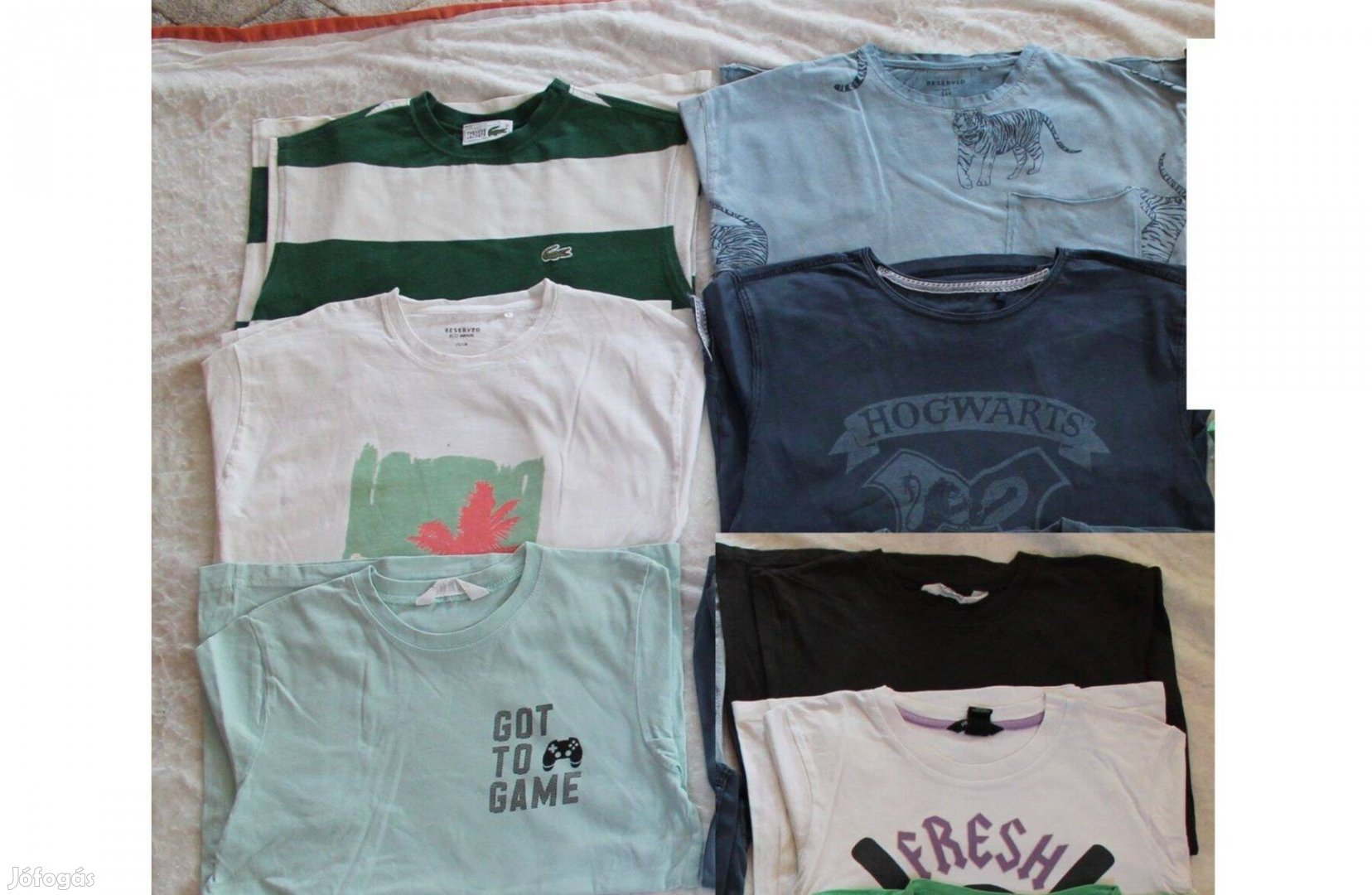 Eladóak beírás szerint 146-152-es méretű pólók hibátlan, a képeken látható állapotban. A fehér-zöld csíkos Lacoste, a sötétkék Hogwarts feliratosa fehér, valamint a kék tigrises Reserved, a többi H&M márkájú. A megadott át darabár.