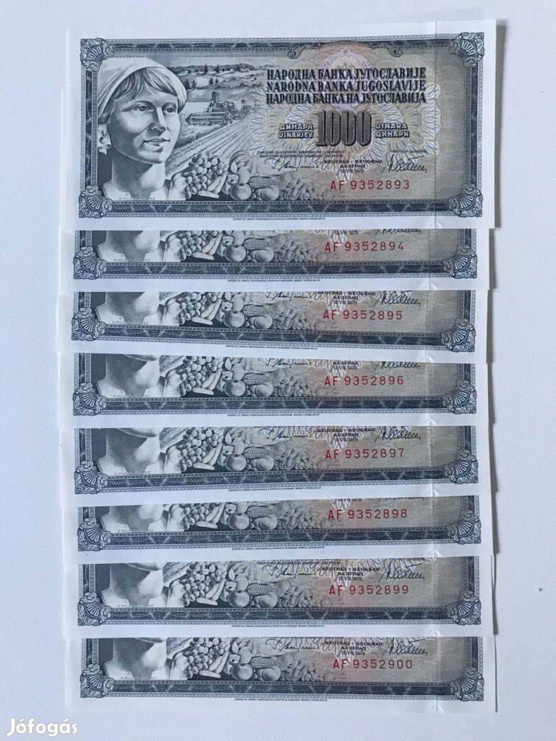 Eladó 8 darabos sorszámkövető 1978-as 1000 dináros bankjegy