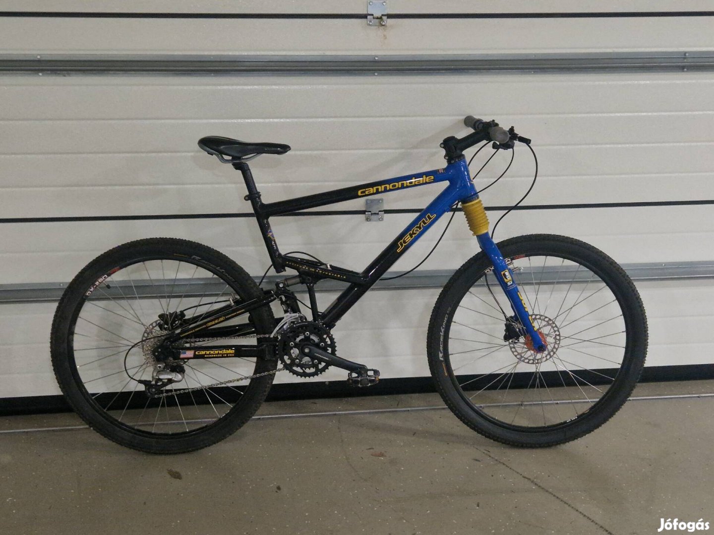 Eladó egy legendás Cannondale Jekyll 500 full suspension mountain bike, kb. 2002-es évjárat. A Jekyll sorozat a Cannondale egyik ikonikus összteleszkópos modellje, amelyet terepezésre és technikás ösvényekre terveztek. Masszív, mégis könnyű alumínium vázzal és kiváló geometriával rendelkezik.