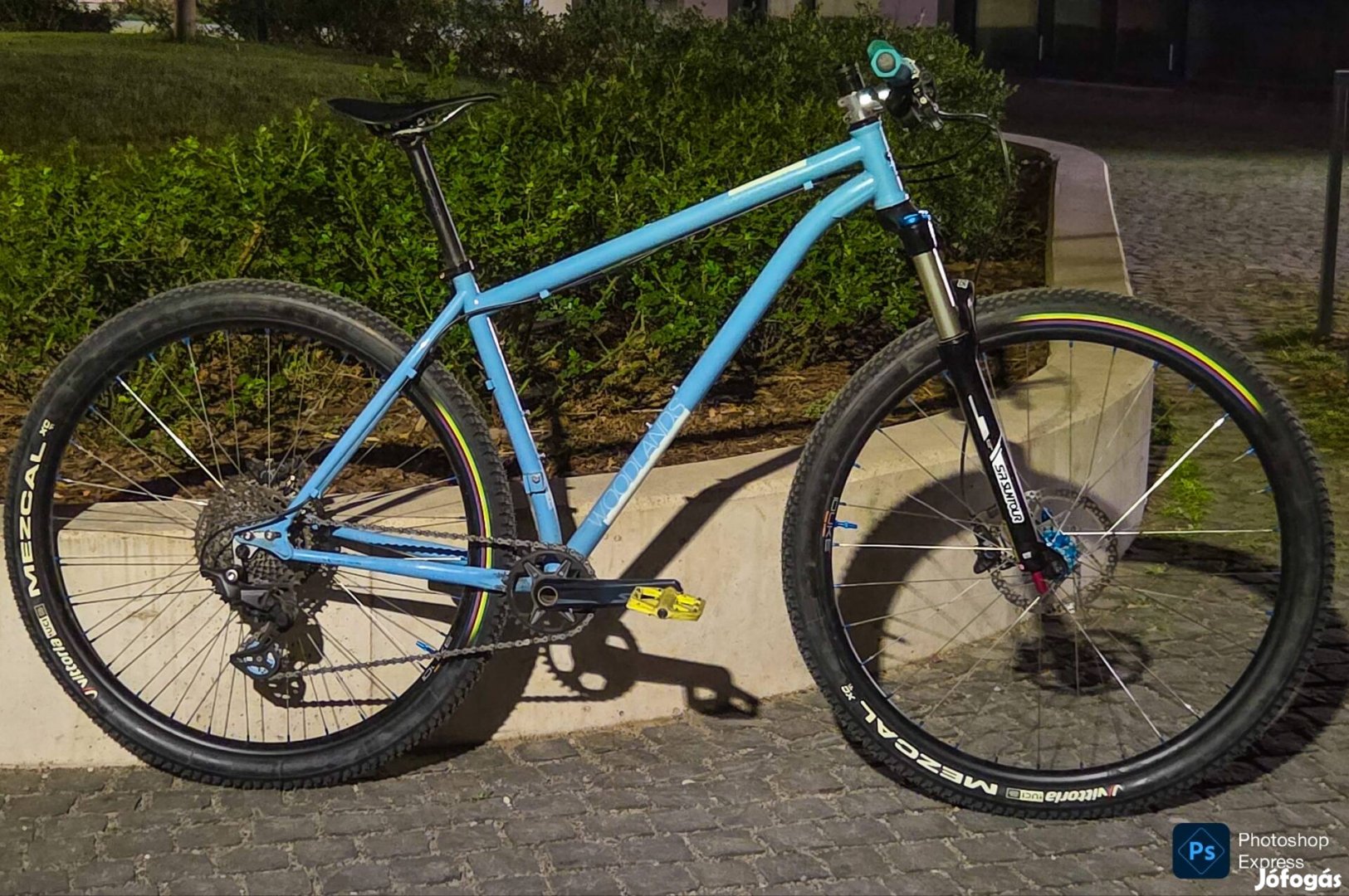 - Váz: Cro-mo acél, M-es méret, 29-es kerekekhez. Teljesen indokolatan babakék de legalább feltűnő.