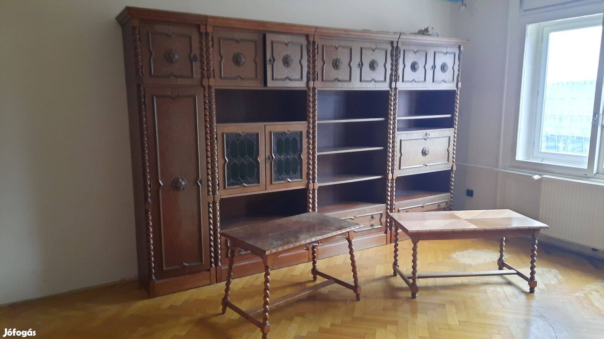 Eladó teljes koliniál bútorcsalád Budapest, XI. kerületben. Szekrénysor, két asztal , két kis szekrény, valamint egy íróasztal.