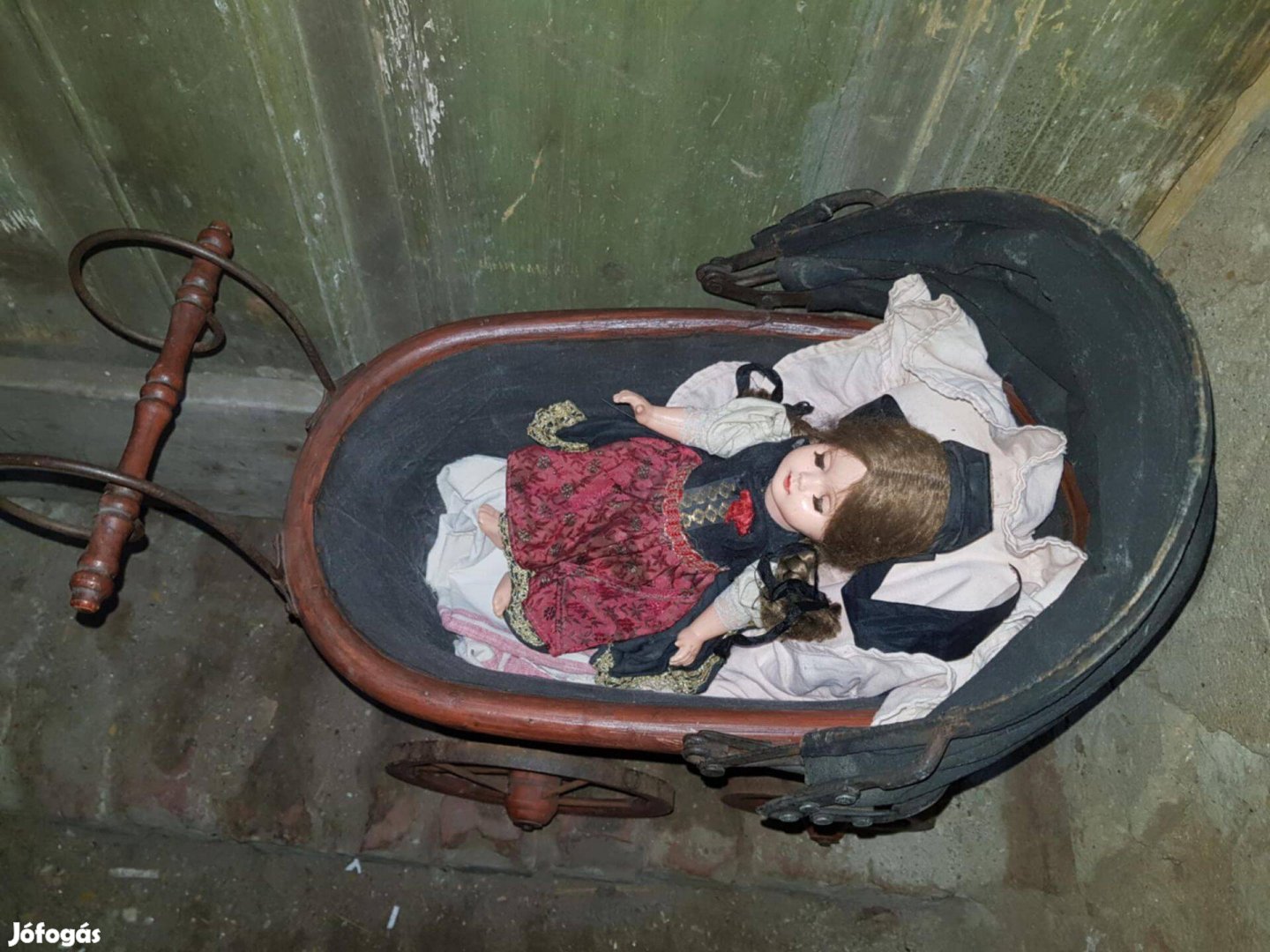 Eladó antik jellegű, hatású babakocsi játék babával