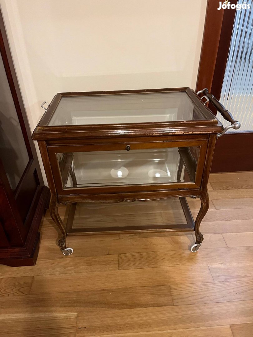 Eladó 70x45x68cm-es antik gördülő zsúrkocsi. Az üvegek épek, a fa felületeken néhol kopás látható. Átvétel személyesen megbeszélés szerint.