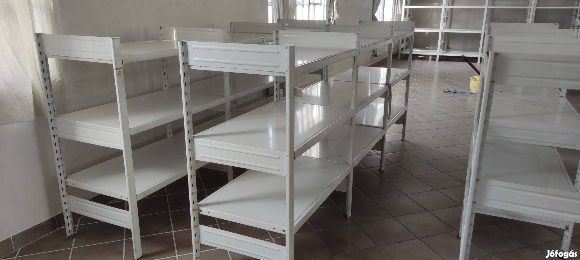 Eladó a képen látható csavarok nélkül összeszerelhető, használt fém polc rendszer fehér színben,