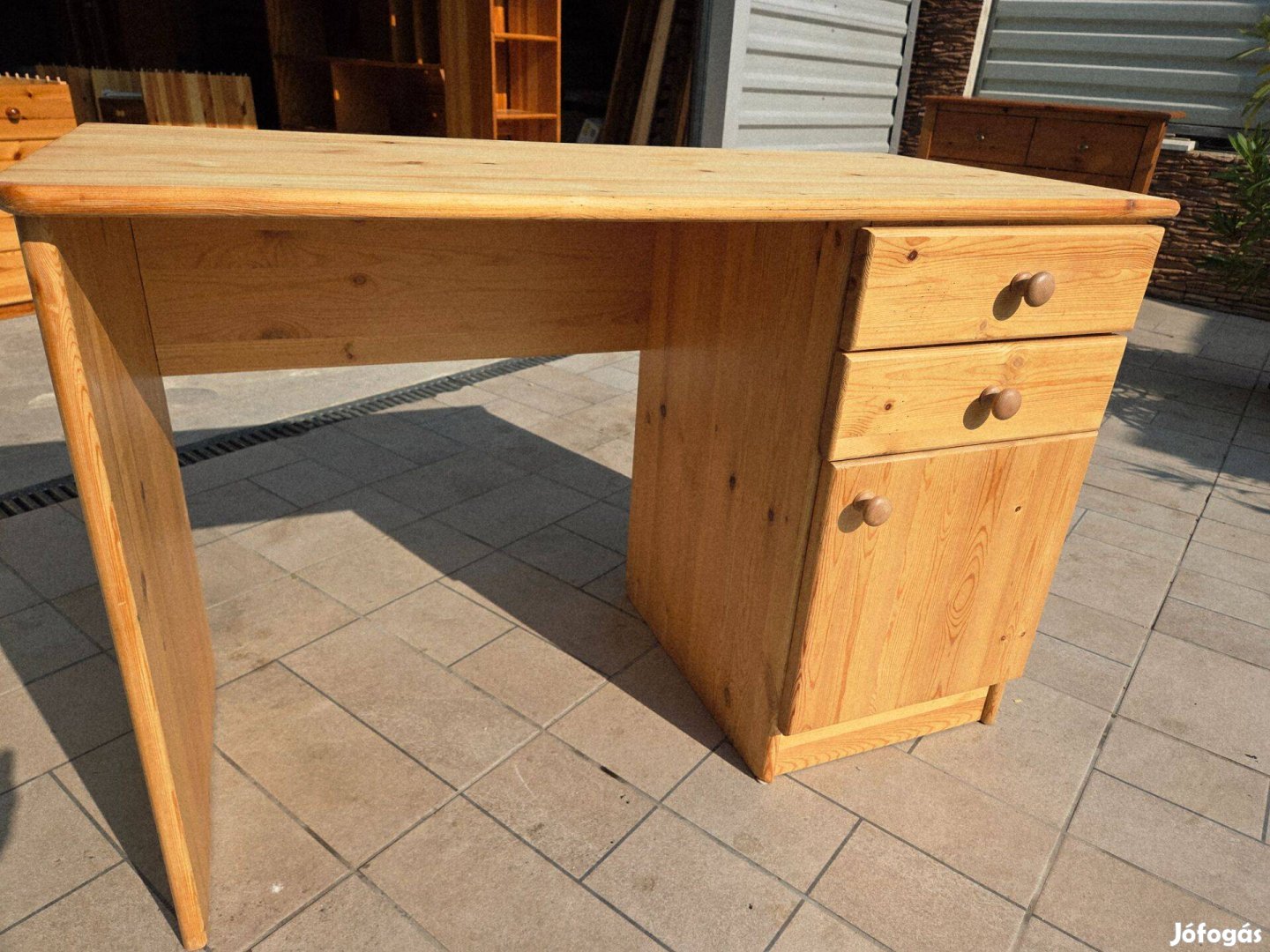 Eladó egy 2 fiókos, polcos fenyő íróasztal.