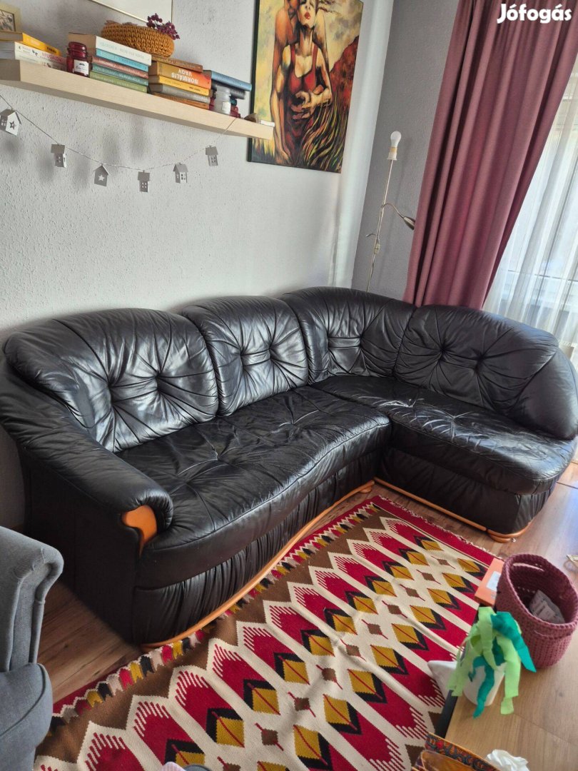 Eladó egy használt, fekete bőr sorokkanapé Újpesten