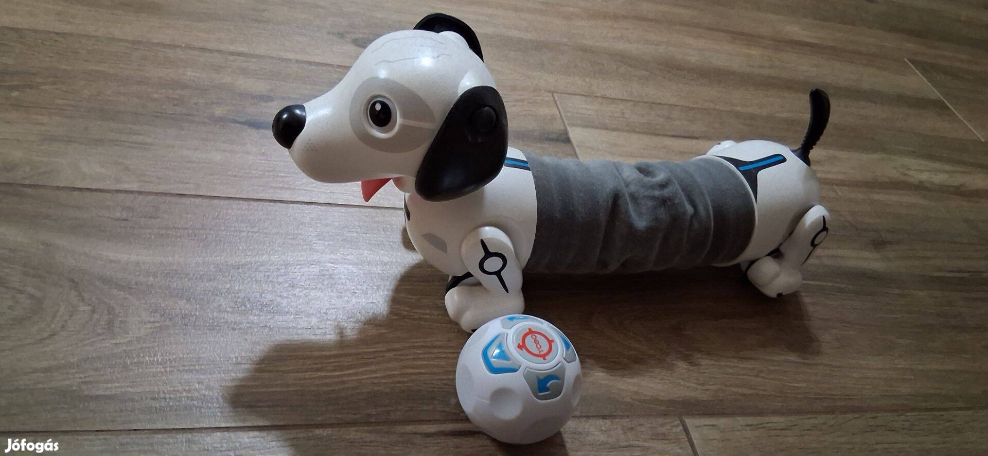 Eladó a képen látható Silverlit Robotacsi (vagy Robo Dackel), egy interaktív robotkutya gyerekjáték, amely képes követni a gazdáját és különféle trükköket végrehajtani. A hozzá tartozó gömb alakú eszköz egy okos labda, amely távirányítóként is funkcionál.