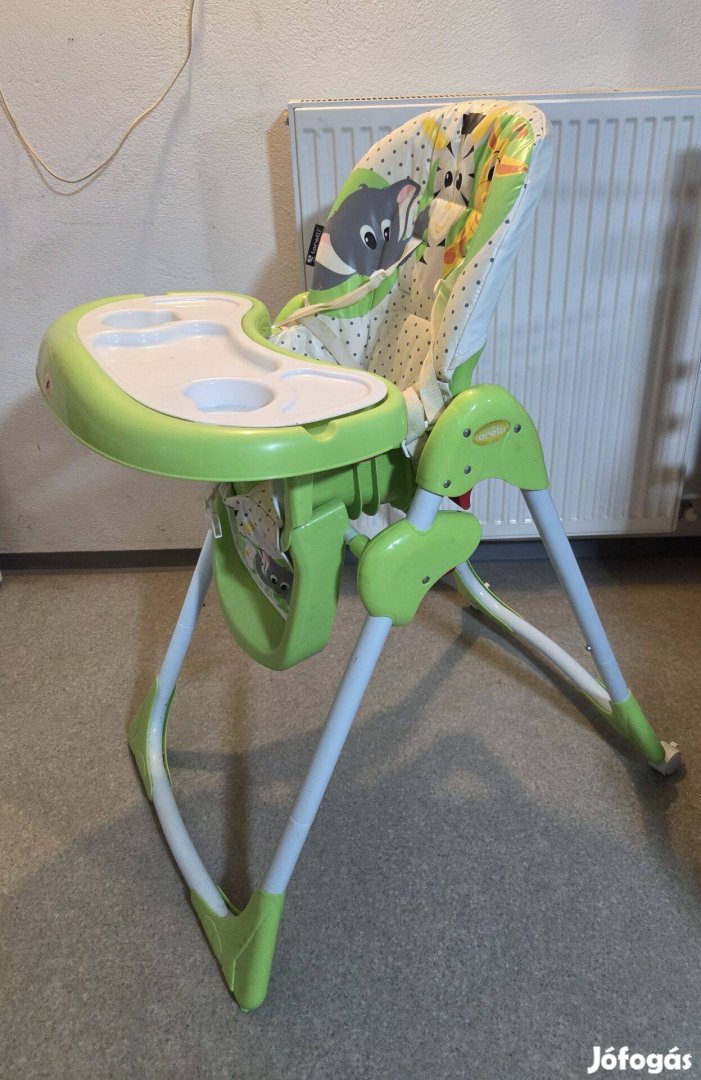 Eladó etetőszék. Duplatálcás, háttámla dőlésszöge, a szék magassága, tálcatávolság állítható, a kerék rögzíthető. Szükség esetén összecsukható. Használatból adódó kisebb sérülések vannak.
