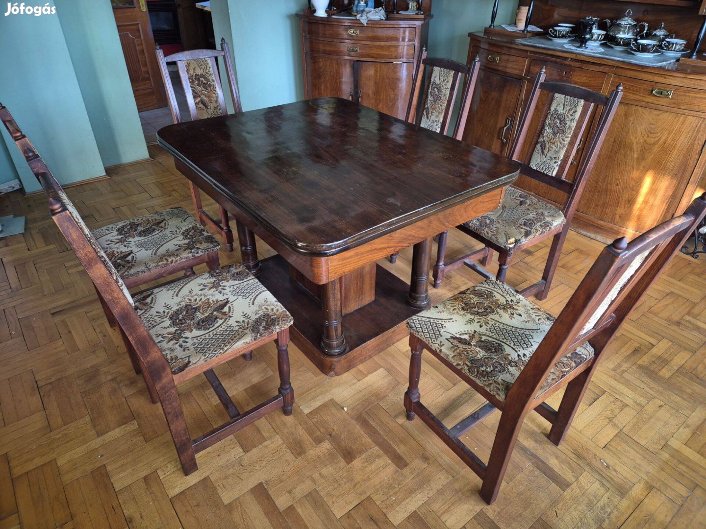 Eladó a képeken látható antik, kihúzható étkezőasztal 6 db modern székkel. A székek huzata sérült, az asztal jó állapotú.