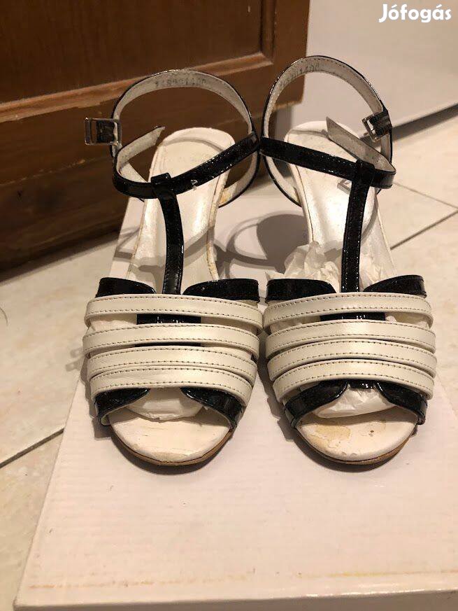sarok magasság: 7 cm. Kopás van rajta. talprésznél, kicsit a lábujjaknál. Lakk hatású anyagú.