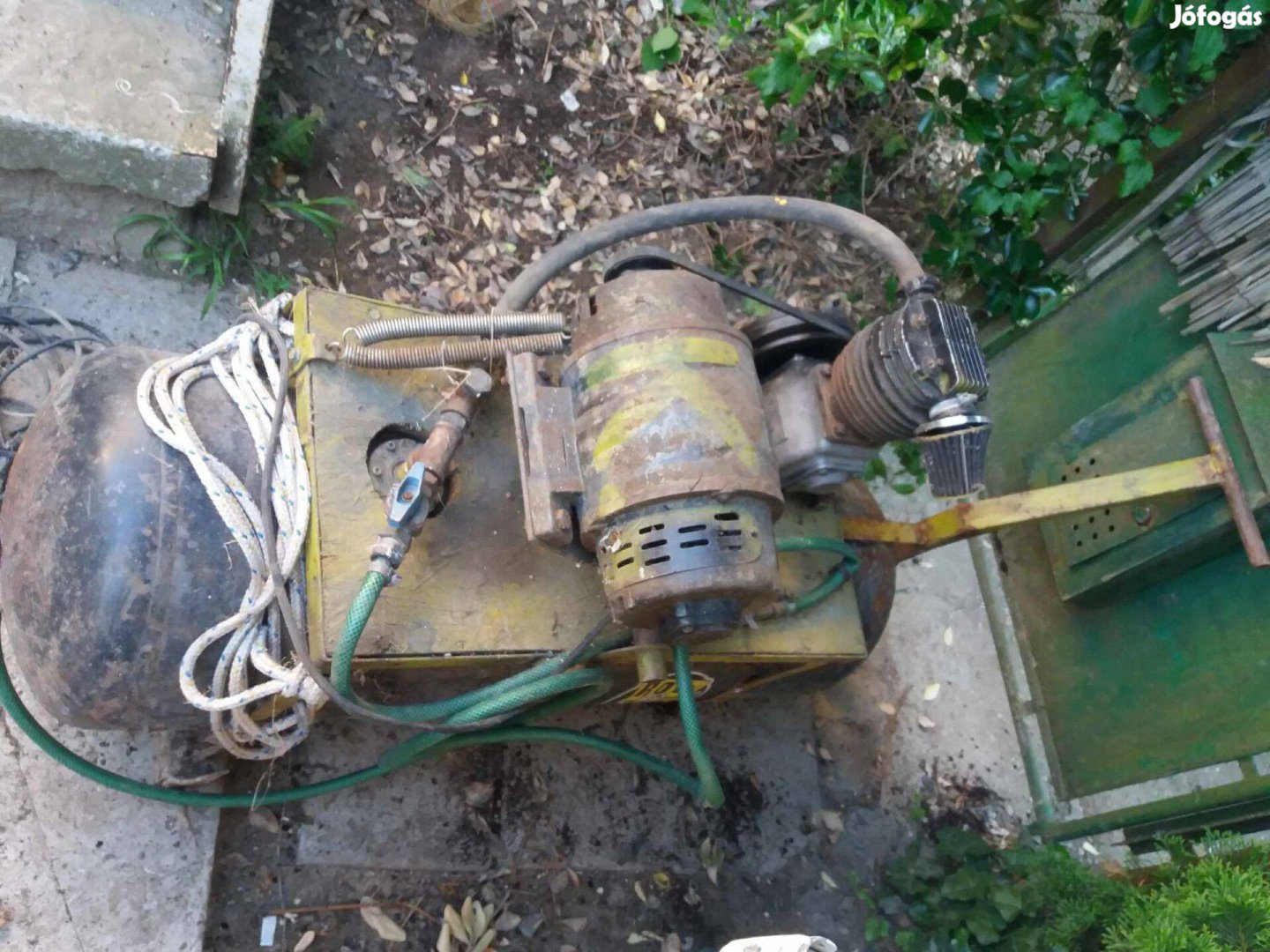 Eladó a képen látható örökölt házi készítésű működőképes kompresszor. Tartálya nagy, nem tudom hány literes. A gép nagyon nehéz. Egyik kereke hiányzik, másik lukas.