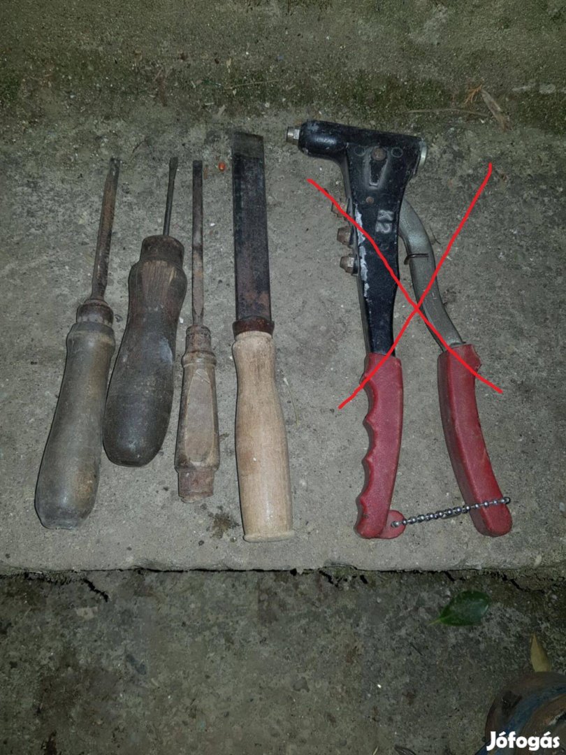 Eladók a képen látható kézi fa vésők reszelők. Az ár az egészre értendő, ha szegecselő is kell, de külön külön is eladó!
