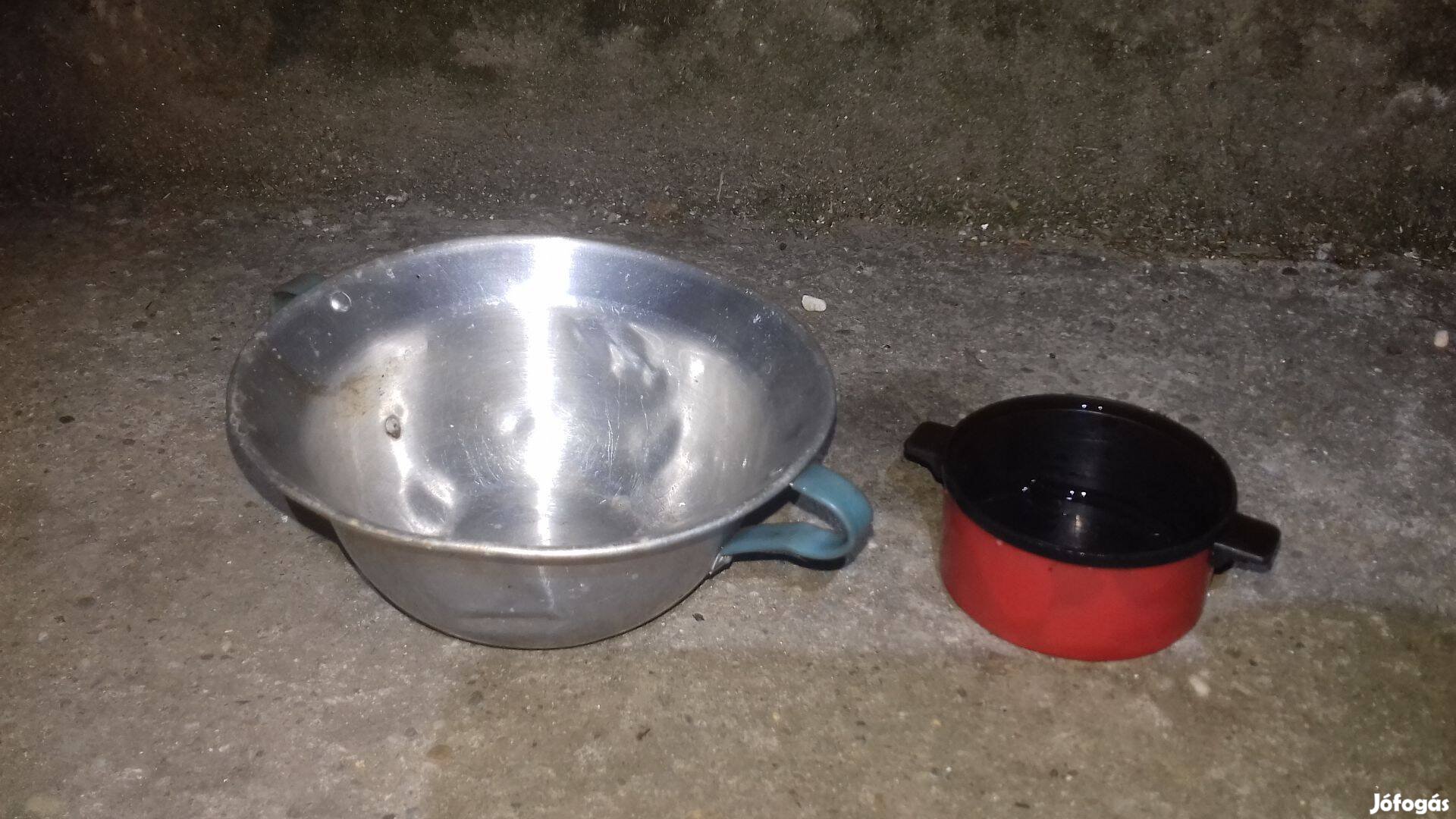 Eladók a képen látható régi kis játék edények. A lavór alumínium, és a 2. képen látható lábas is. A piros lábas műanyag. Akár Barbie játék kiegészítőjeként.