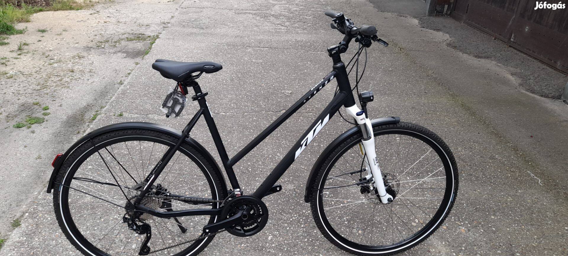 Eladó a képeken szereplő KTM Avenza cross street teljesen új, null kilométeres női trekking kerékpár, 56 cm vázmérettel, hidraulikus tárcsafékekkel, lezárható első villateleszkóppal, agydinamós világítással, duplafalú szegecselt kerekekkel, szögben állítható kormányszárral, Shimano Deore 30 sebességes váltással, kazettás kerékaggyal, integrált hajtással, A kerékpár megtekinthető Óbudán a Flórián tér közelében.