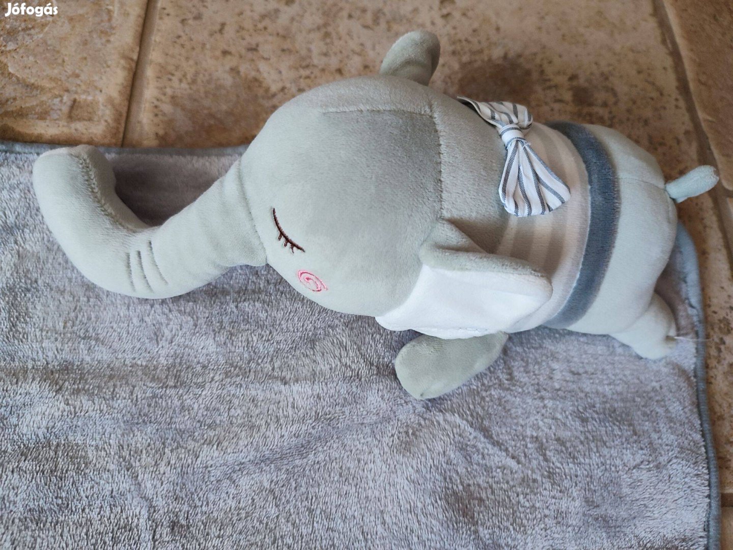 Szürke színű, lágy, plüss tapintású gyerek takaró, melyen egy kis elefántos plüssjáték van.