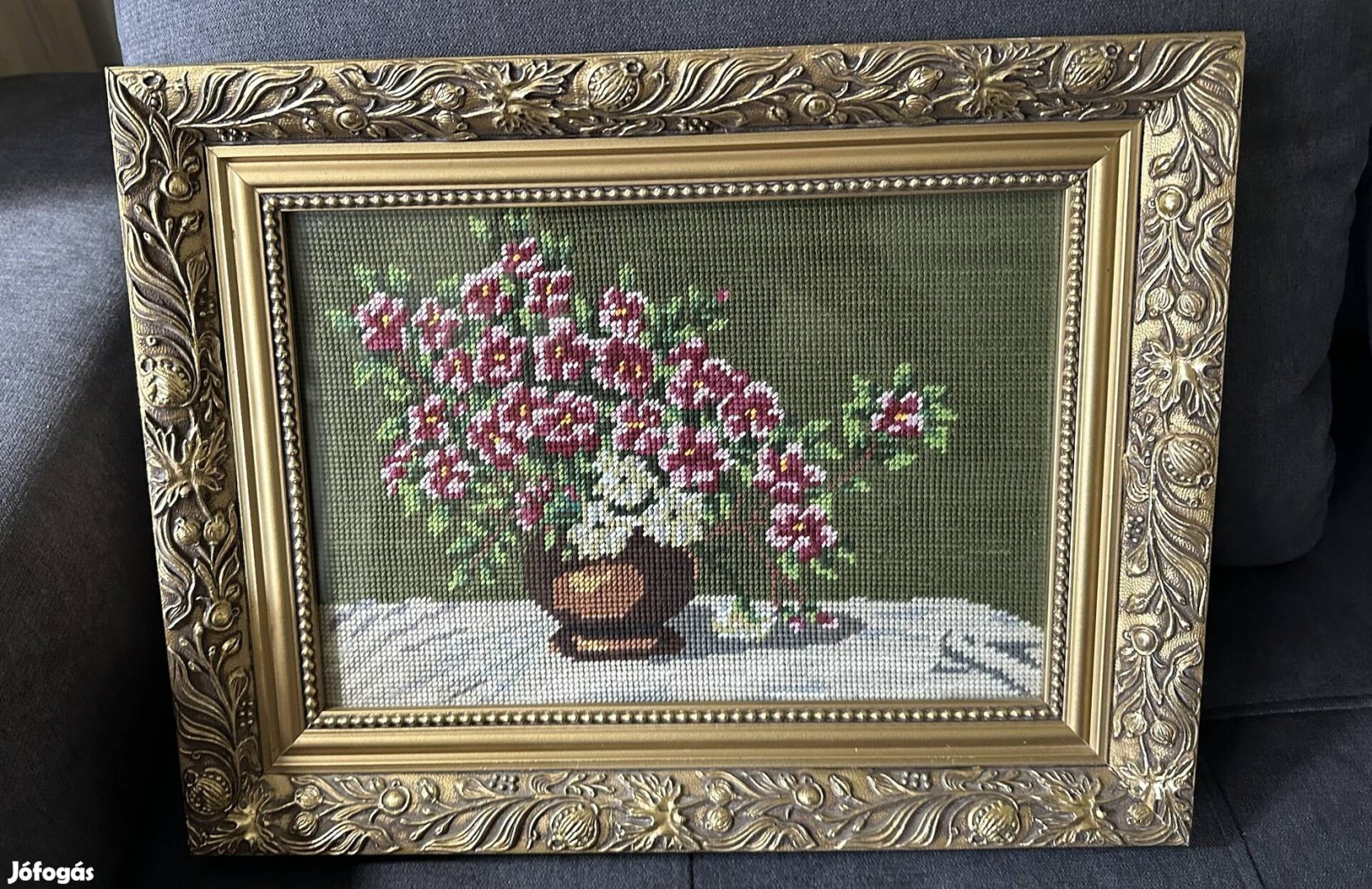 Elegáns, klasszikus stílusú Goblein kép, díszes arany színű keretben eladó Budán!