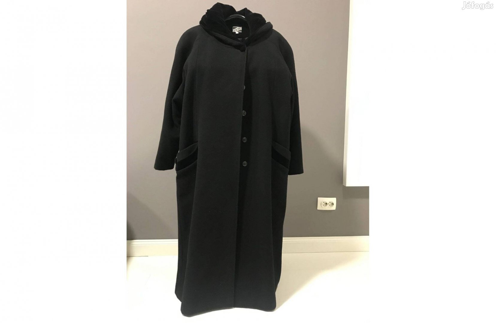 Alkalmi hosszú fekete szövet kabát plüss kapucnival.