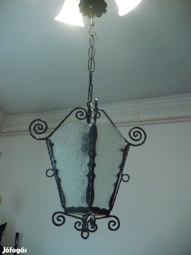 Elegáns kivitelű kovácsoltvas jellegű mennyezeti lámpa eladó ép üveglapokkal, tökéletes darab, szem. átvét. 17. ker. Rcsaba, további termékek hirdetéseimnél.