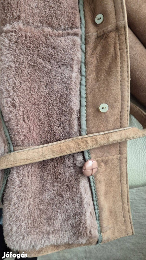 A kabát Törökországban vásárolt, nagyon jó minőségű hasított bőrből készült, belül puha, meleg szőrmés, amely tökéletes választás a hideg napokra. A galléron és a kézelőkön található halványlila árnyalatú szőrme díszítés nőies, stílusos megjelenést kölcsönöz.