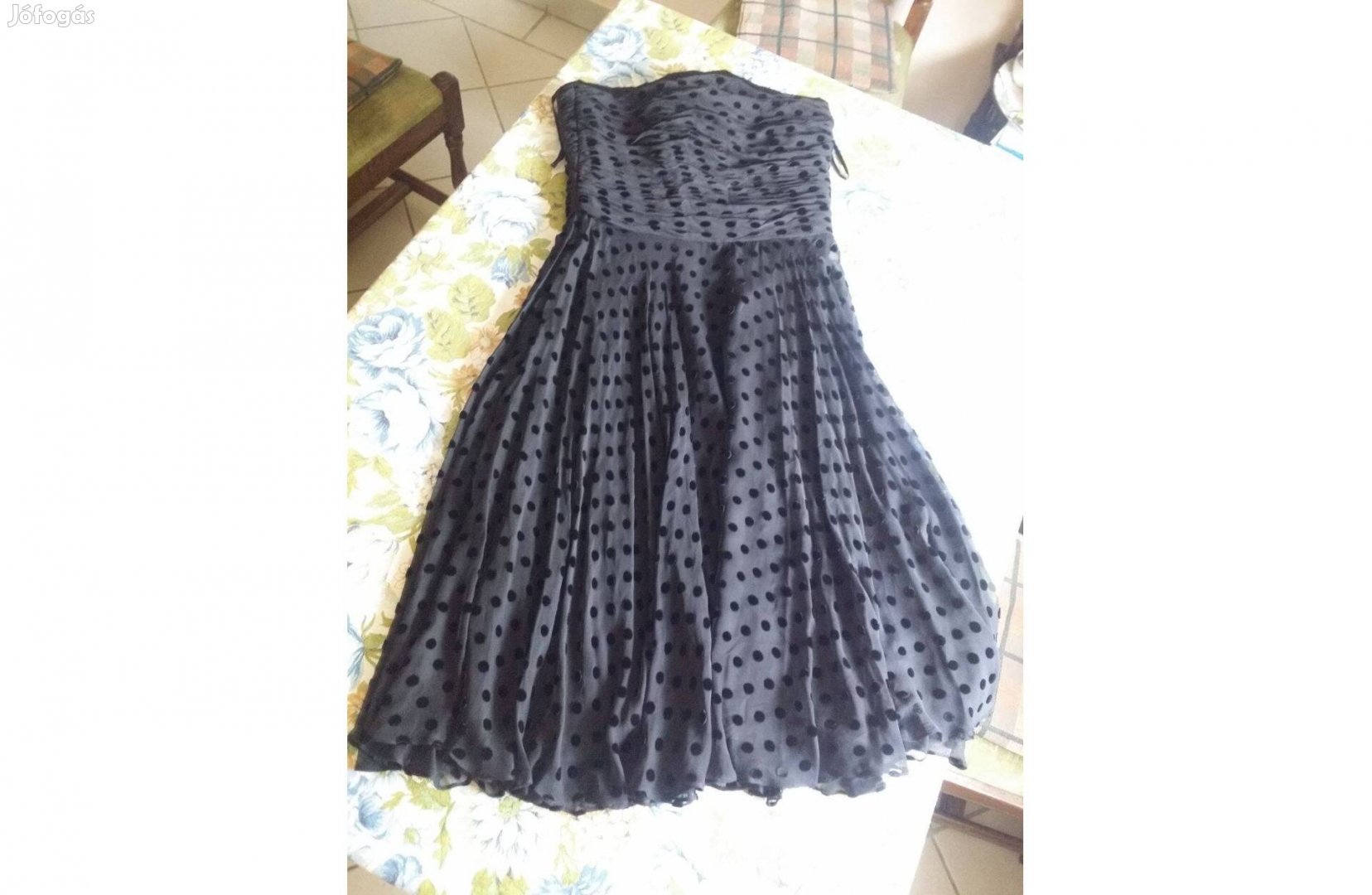 Jó esésű, fekete 65% selyem, 35% viszkóz, pánt nélküli, bélelt 14-es alkalmi, anyagában pöttyös ruha eladó.