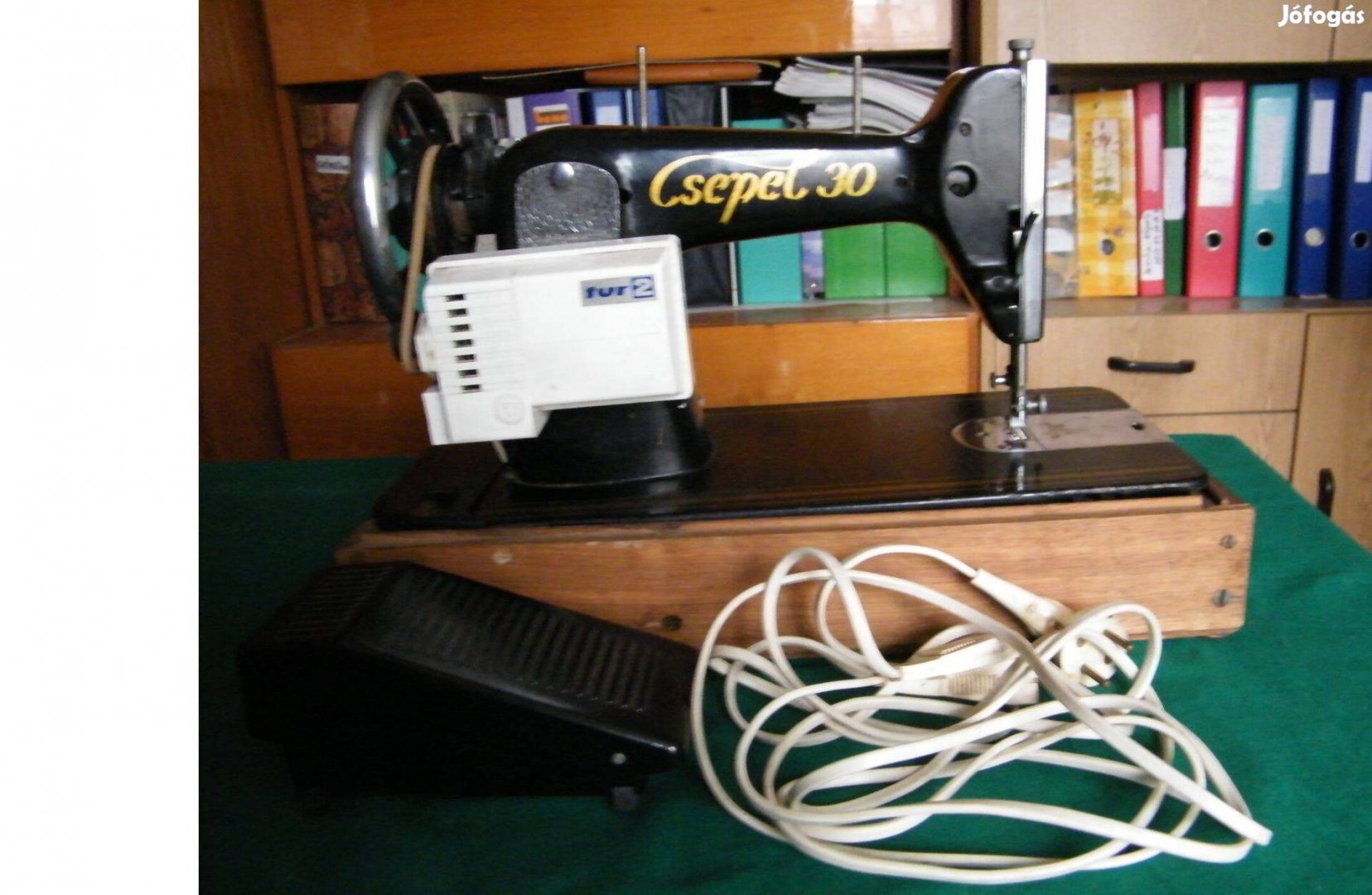 Csepel 30 varrógép üzemképes, lengyel Tur 2-es motorral elektromos hajtásra átalakítva. Hajtó szíj, orsózó gumi, orsófedél rögzítő lemezrugó cserére szorul.