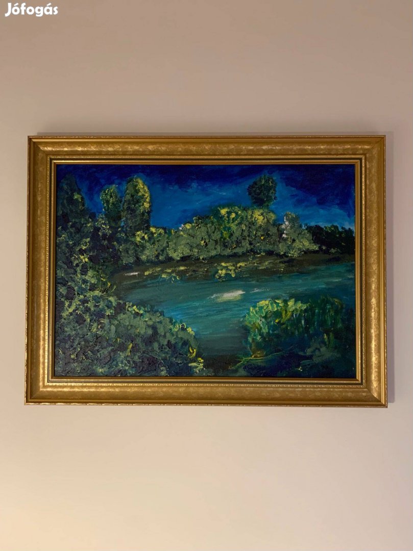 Eladásra kínálok egy gyönyörű, élénk színű olajfestményt (62×82 cm, kerettel) arany színű klasszikus profilú keretben (Darvasi Képkeret Kft. 3805-ös típus).