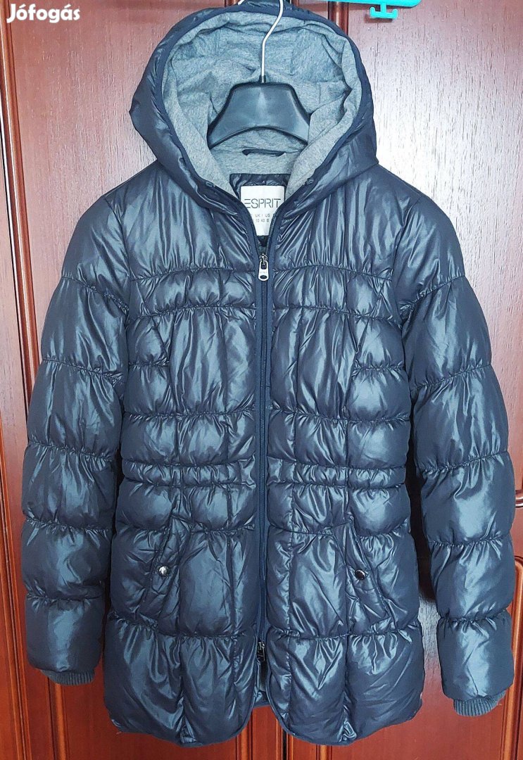 Esprit márkájú, legújabb divatú, csinos fazonú, antracit ( ezüstös sötét szürke) színű, finom tapintású, pehely töltetű) meleg női kapucnis normál hosszúságú kabát , patenttal, zipp-zárral záródó, belül derékban zsinórral szűkíthető, és nagy belső zsebe is van, kívül patenttal záródó svéd zsebei vannak, 36-os méretű, gyönyörű , hibátlan, újszerű állapotban eladó.