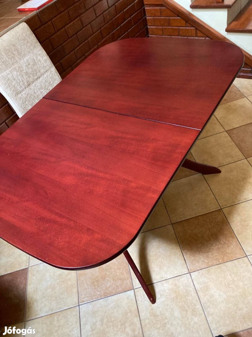 Mahagóni színű étkezőasztal eladó: tömör fa láb, furnér-fa asztallap, 135x80 cm, bővíthető 180x80 cm méretűre, szép állapot, stabil szerkezet. Az asztallapon kisebb karcolás nyomok, inkább esztétikai hiba, de a lap nem sérült.