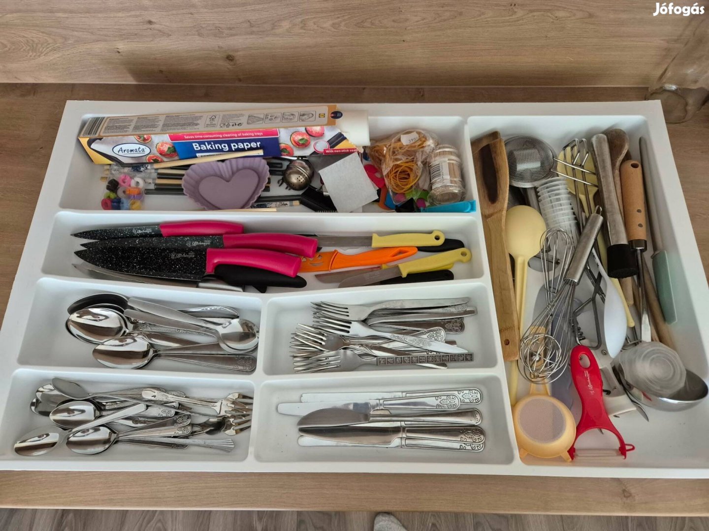Alig használt evőeszköz tartó (üresen, az evőeszközök csak szemléltetésnek vannak benne). Méret: 82 széles*47,5 mély*6,5cm magas.
