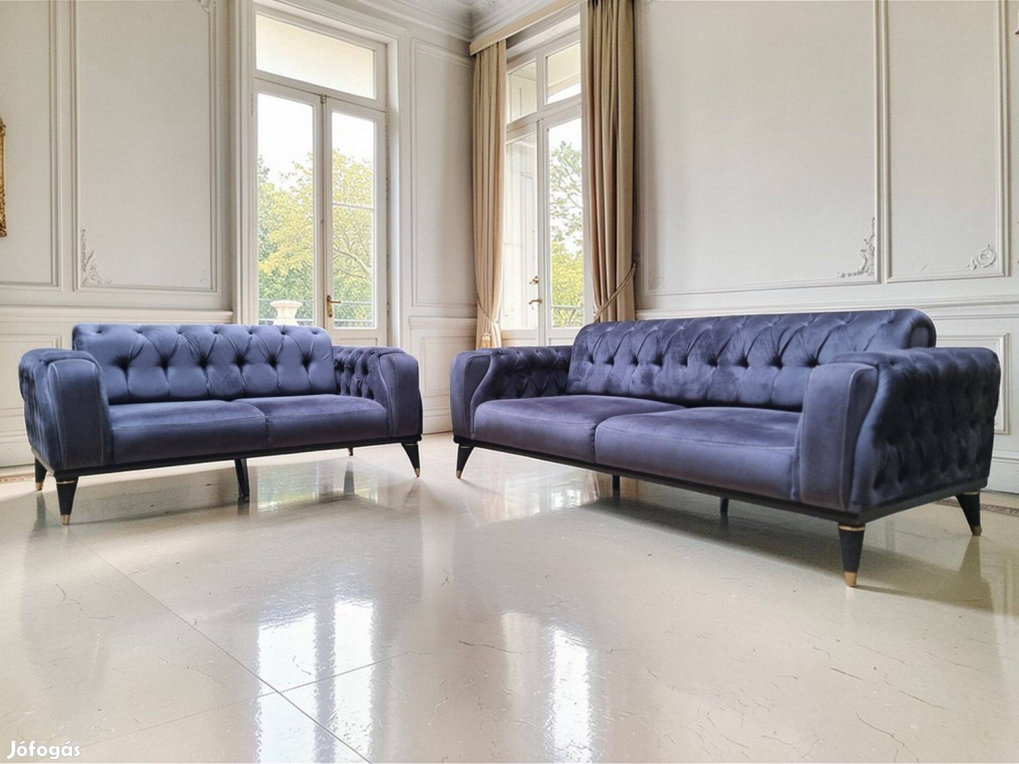 Exkluzív chesterfield stílusú, gombtűzött, antracit sötétszürke bársony ülőgarnitúra (3+2).