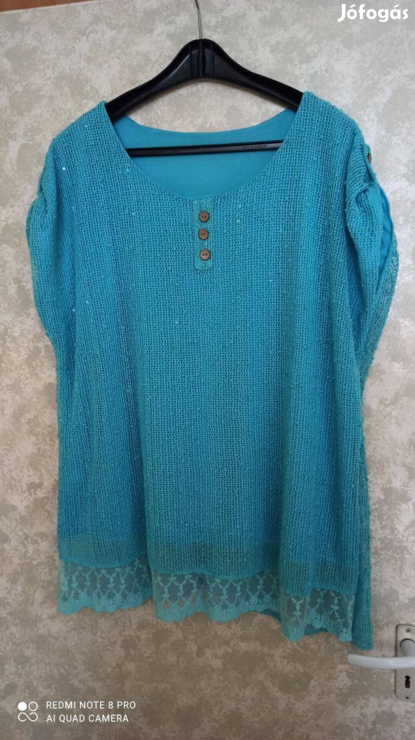 Extra nagy méretű kék ujjatlan felső flitterekkel díszített 56-58-as méretű új állapotú 2800 Ft-ért eladó.