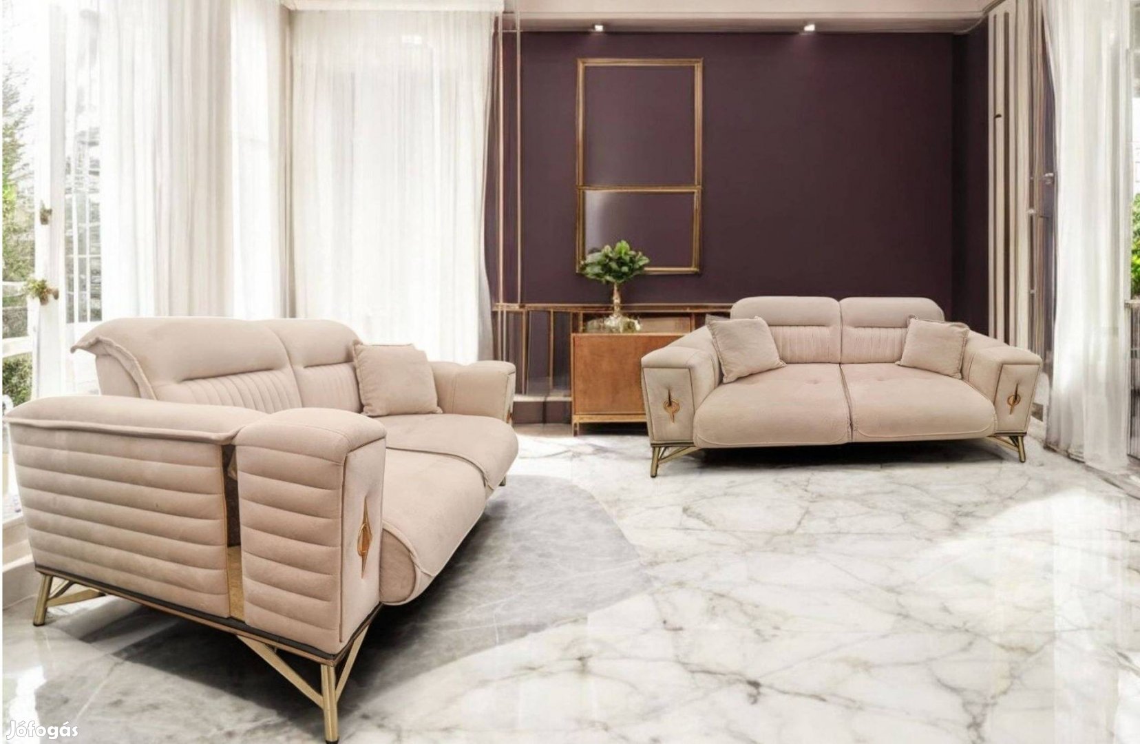 Extravagáns 2 db egyforma bézs bársony ülőgarnitúra, párnákkal
