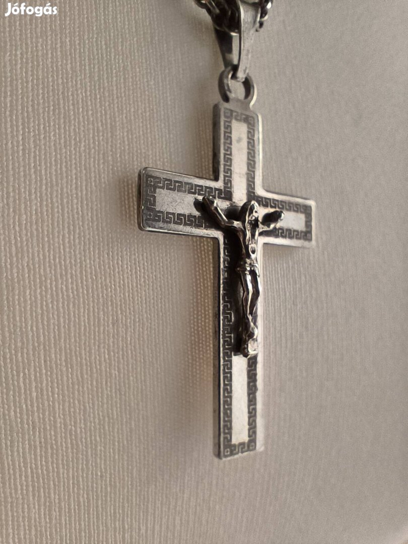 Jelzett ezüst nyaklánc, Bvlgari kapoccsal, szintén jelzett ezüst, szegecselt kereszt medállal. + díszdoboz