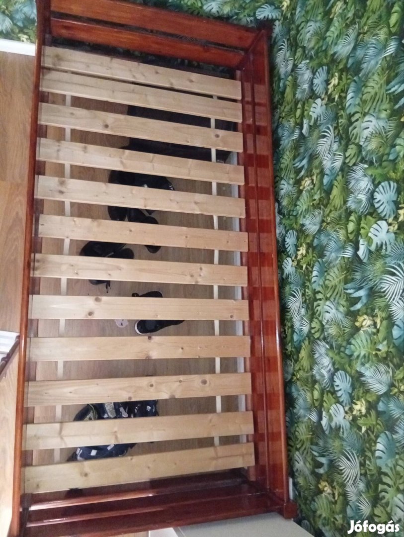 Mahagóni színű fából készült ágykeret ágyráccsal eladó kihasználtság miatt. Pontos méret: 202×98 cm. Szétszerelve szállítható