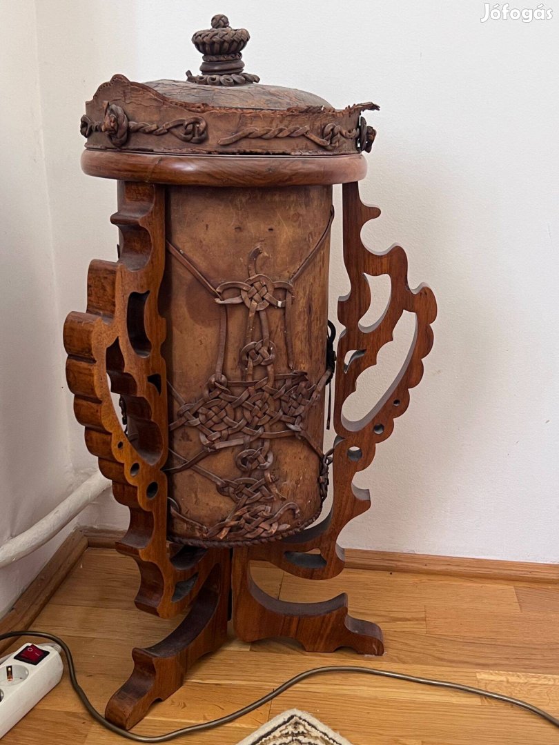 Eladó egy különleges megjelenésű, XIX. század második feléből származó antik fa-bőr tároló. A tárgy látványos fa vázzal és díszes bőrborítással rendelkezik, amely bár korából adódóan erősen sérült állapotú, patinás és egyedi hangulatot áraszt.A tároló tekintélyes, 70 cm-es magasságával és gazdag faragásaival kiváló dekorációs elem vagy restaurálási alap lehet.