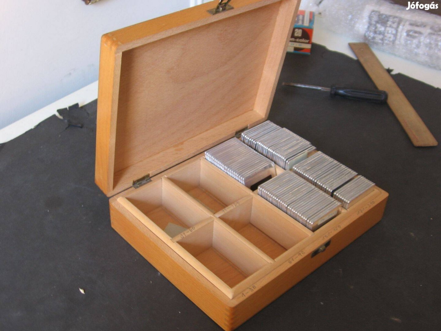 Fából készült , rekeszelt diatároló doboz