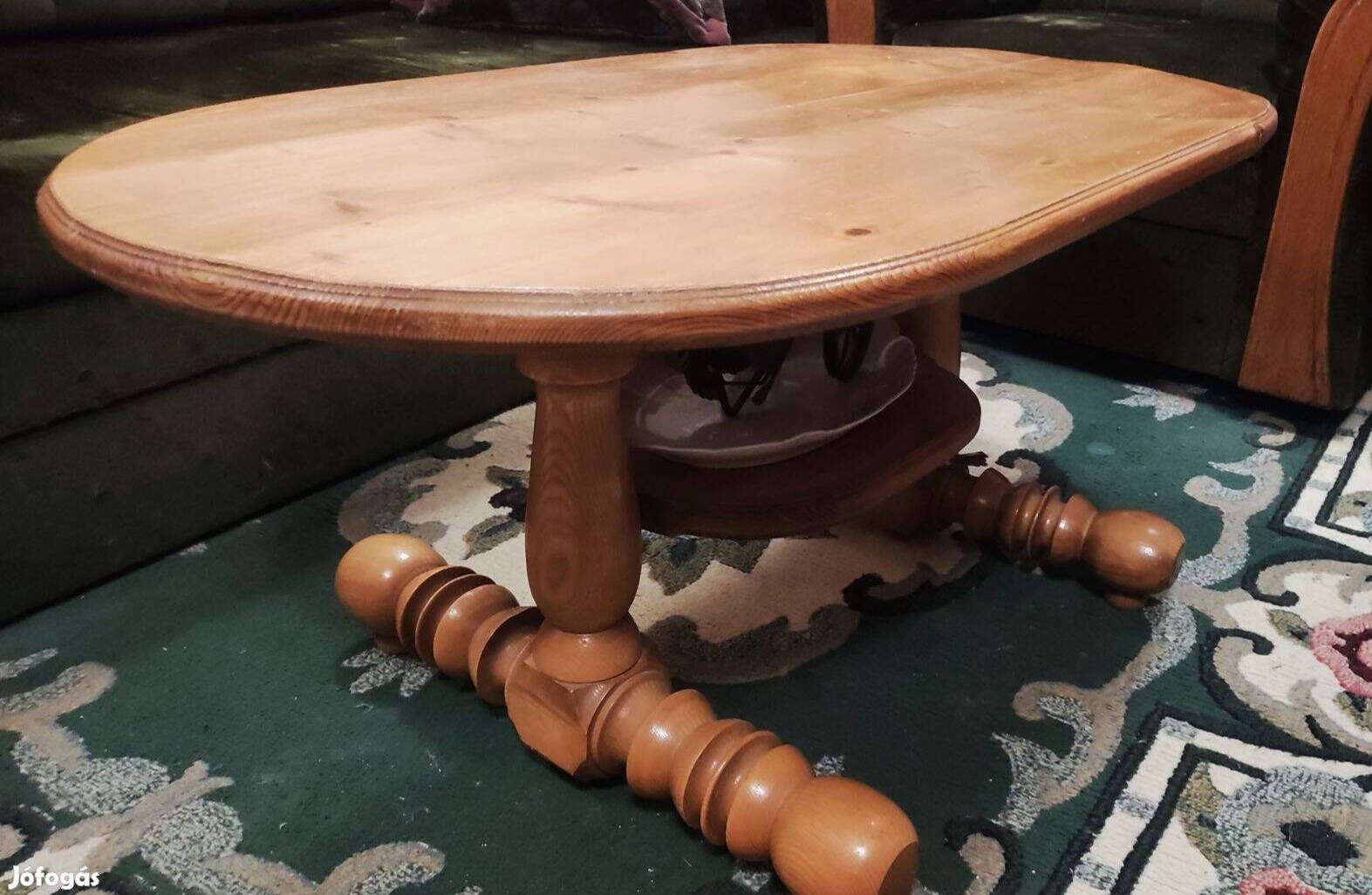 Eladó a képen látható fa dohányzóasztal. A természetes fa szín és az esztergált, díszített lábak klasszikus megjelenést adnak.