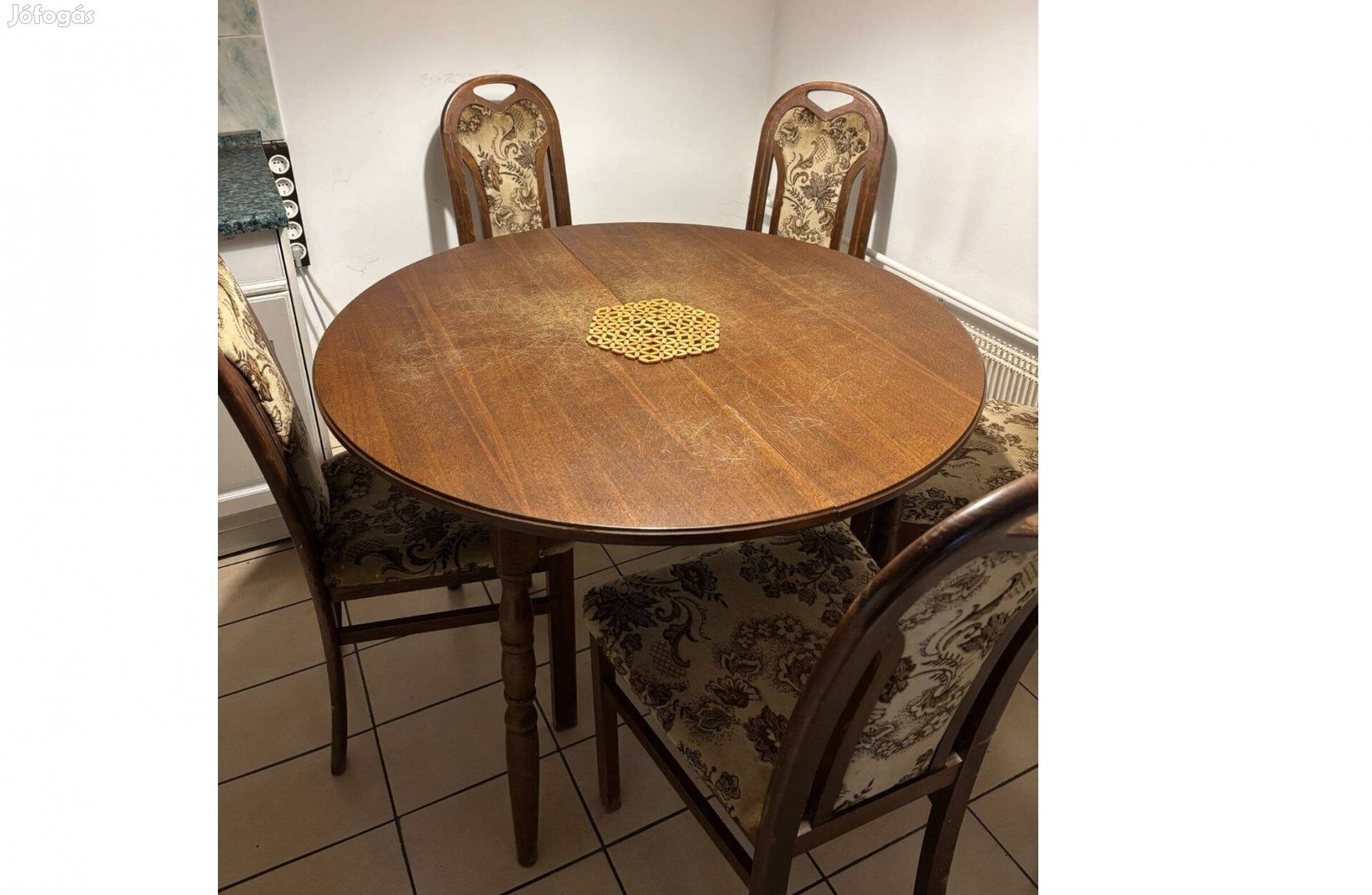 140 cm átmérőjű asztal (+40 cm-el bővíthető) 6 db párnázott székkel eladó. A székek plüss kárpitja nem foltos, nem szakadt.