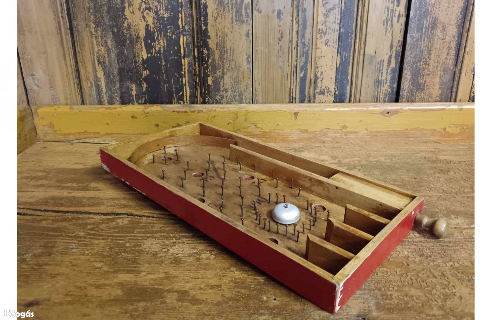 Eladó a képeken látható 20. század közepéről, 60-as évekből származó fa kilövős ügyességi játék. Néhány szög hiányzik a képeken, de azóta pótolva lettek, méret a fotókon. Működik, egy fagolyó van hozzá, de csapágy golyóval is működhet. Ára: 19.990.- (posta megoldható)