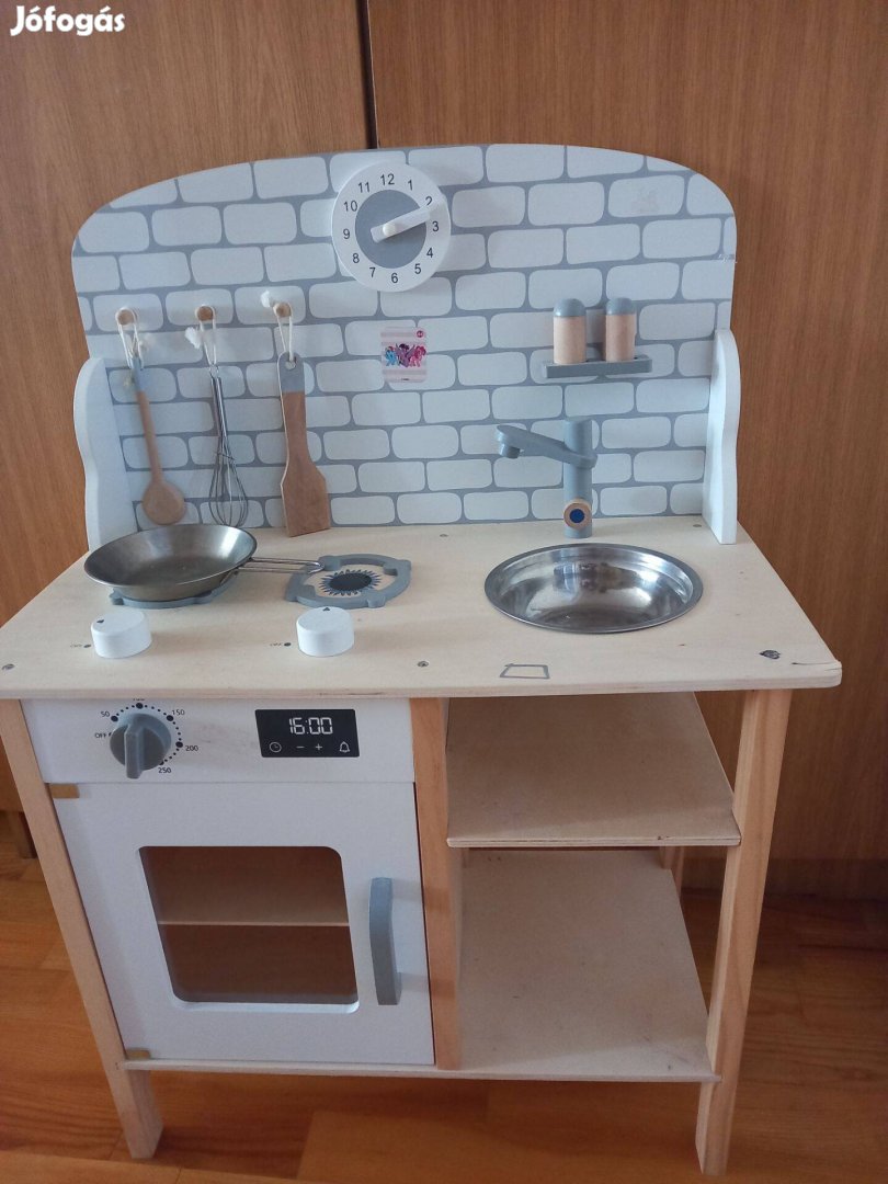 Keveset használt, jó állapotú fa gyerekkonyha (Toy lino), lapraszerelt, összeszerelési útmutatóval