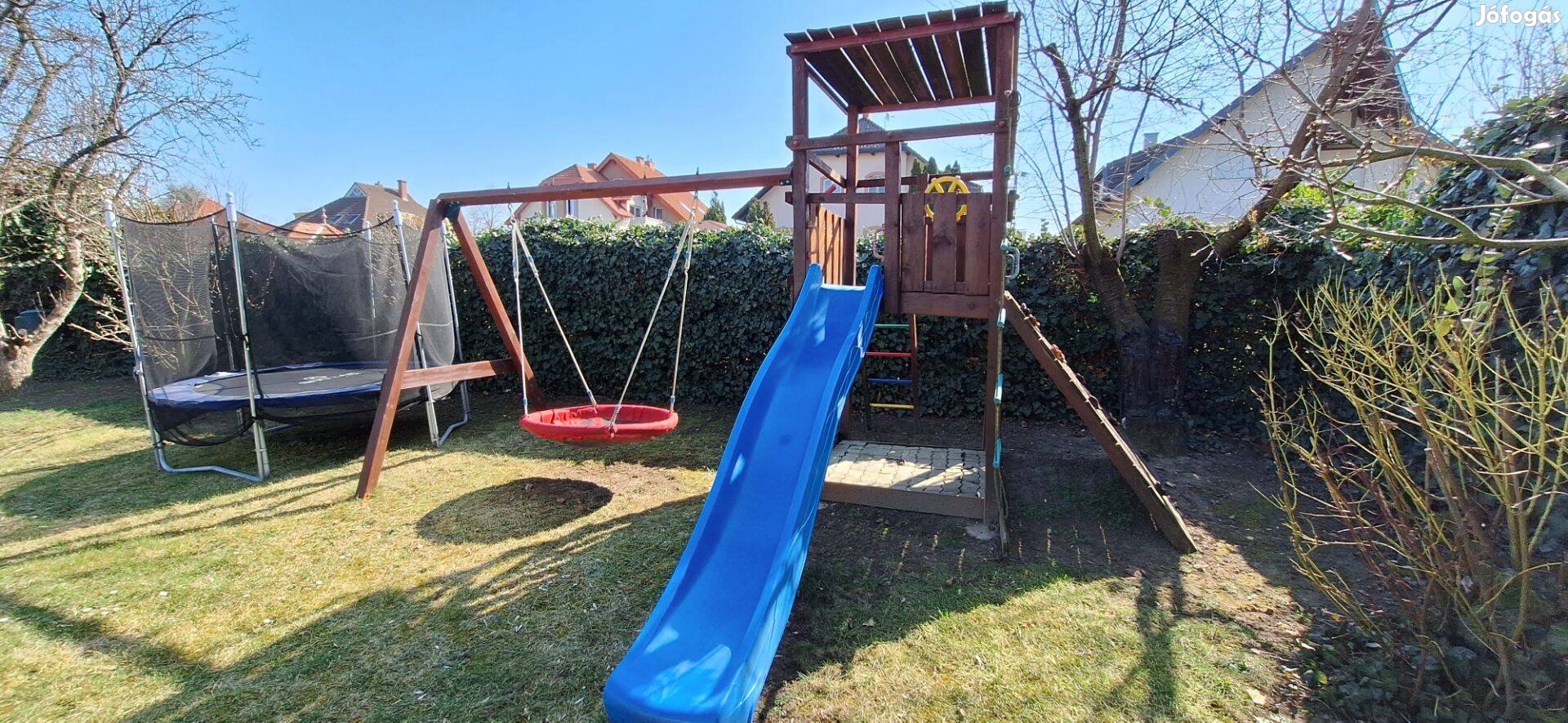 Eladó, a mellékelt képeken látható fa kerti játszótér, toronnyal, fém fokokkal szerelt létrával, mászófallal, kötéllétrával, csúszdával, két állású hintaállvánnyal. Tartozék továbbá egy fészekhinta, három további, hagyományos és egy tányérhinta.