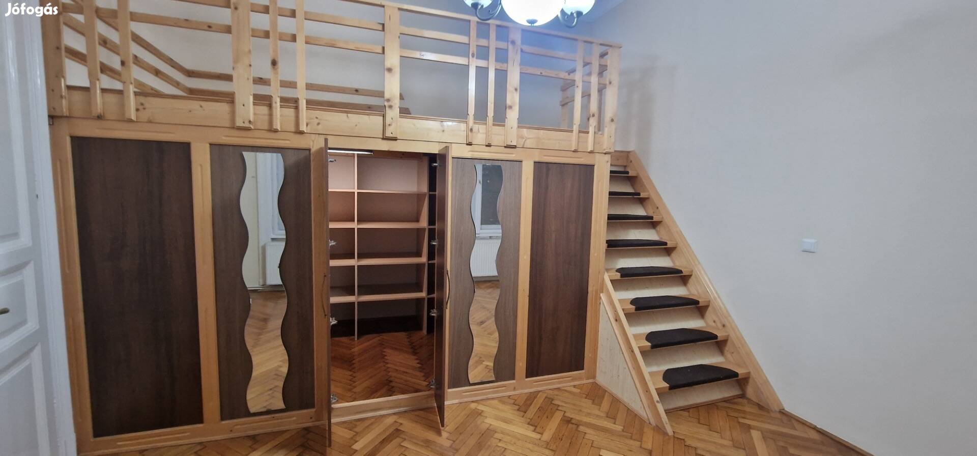 Fa szerkezetű galéria, mely beépített gardróbot tartalmaz, biztonságos korláttal, széles és nem meredek lépcsővel, így nincs leesési veszély. A szerkezet jó minőségű faanyagból készült, jó állapotú. Méretei 340 (+80 lépcső) x200x200cm (a lépcső 80 cm-re ér ki elé). A korlát magassága 70 cm. A gardrób rész teljesen polcozott.