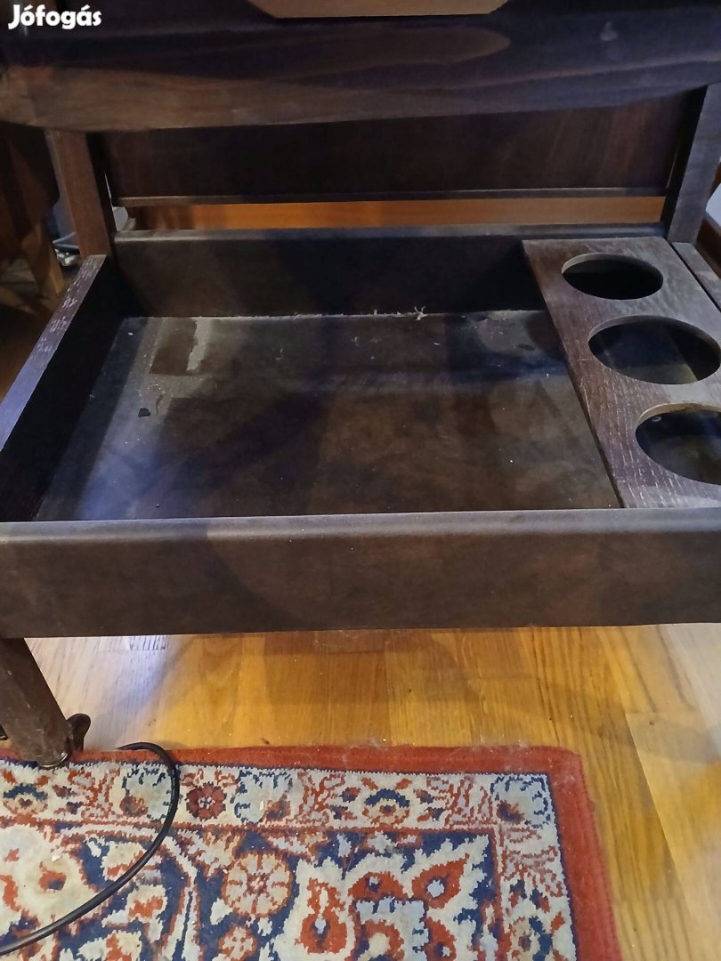 Fa zsúrkocsi , kerekeken guruló . Az oldalán felhajtható , ezáltal az asztal része bővíthető . Ital taró rekesszel az alsó polcon .