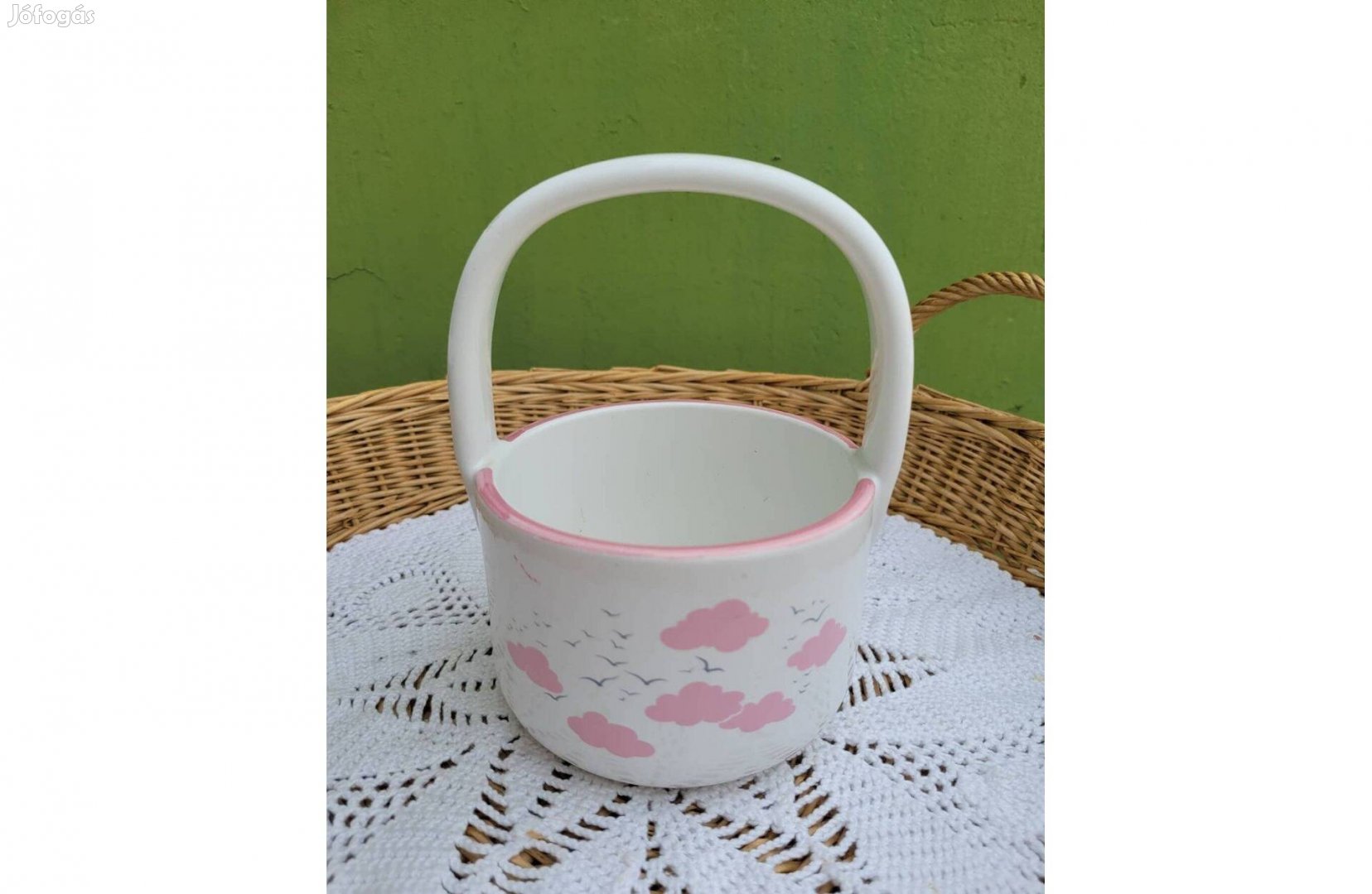 Eladásra kínálom a képen szereplő fajansz kosárkát A képek magukért beszélnek. Körbe fotóztam. Matricával jelzett. A fülén kicsi lepattanás, fotóztam.