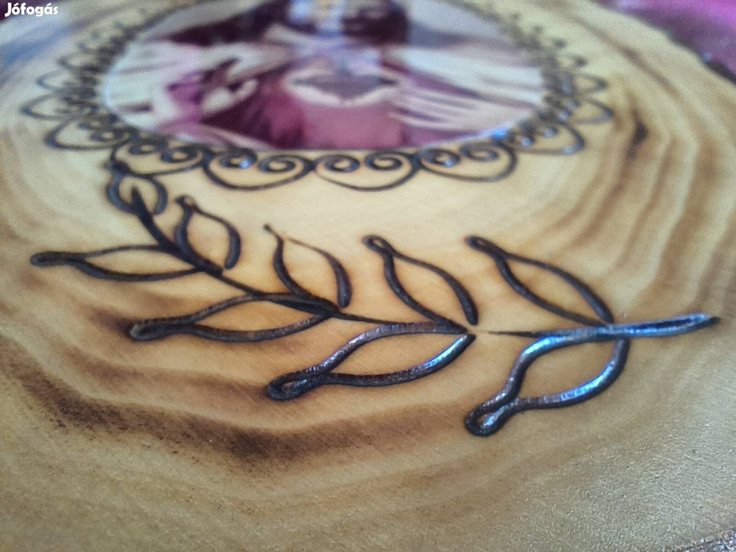 Régi, fa korongra rögzített Jézus szíve szent kép, a fa pirográf díszítéssel, lakozottan, akasztóval ellátva. Igen minőségi darab.