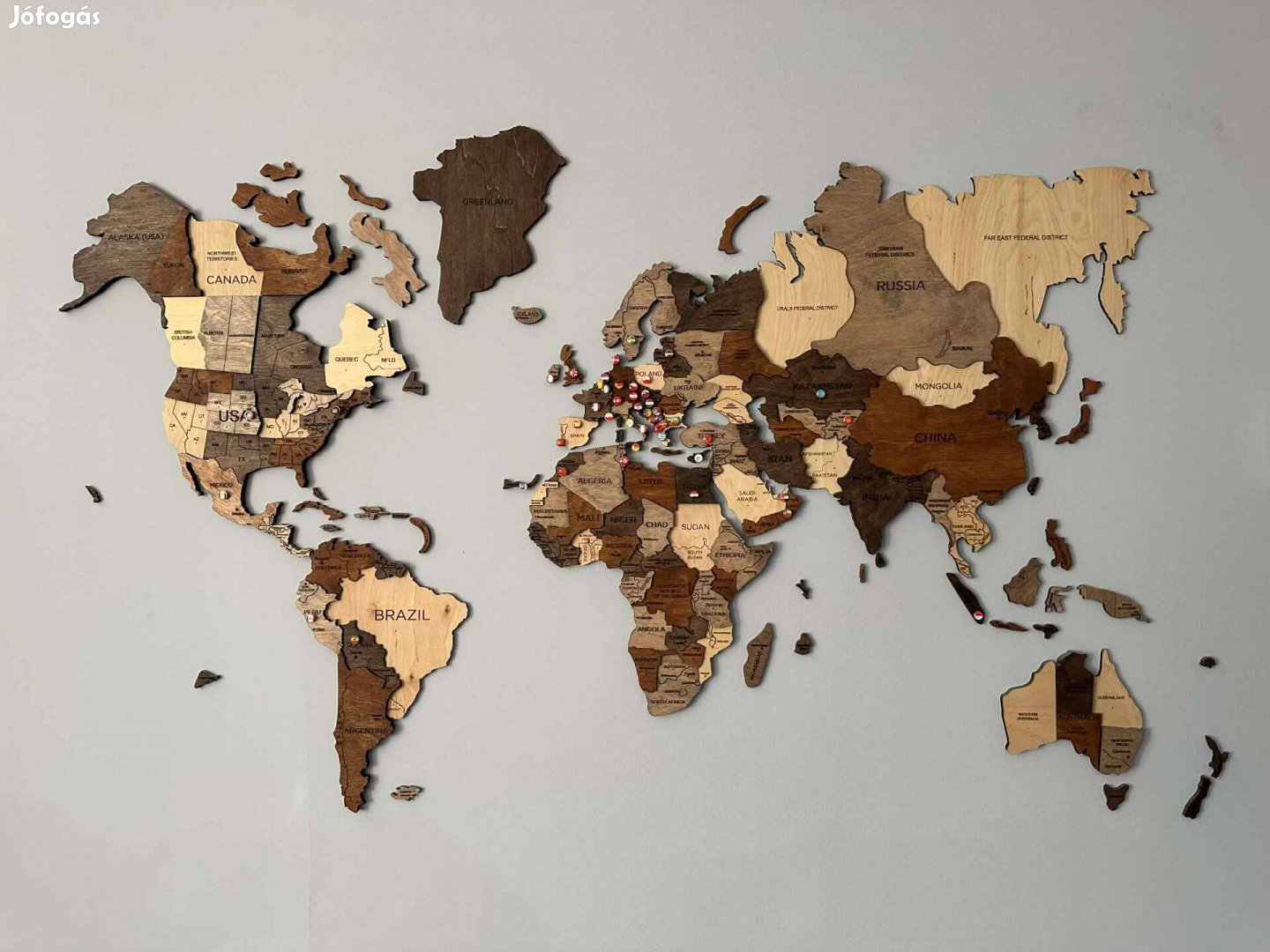 Lézerrel vágott, rétegelt, fából készült világtérkép. Önmagában is remek, látványos otthoni kiegészítő, de lehetőséget biztosít a már meglátogatott, vagy meglátogatni kívánt országok megjelölésére is.