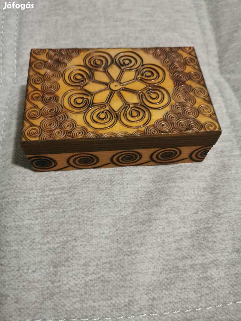 Eladó egy használaton kívüli barna színű faragott díszdoboz.